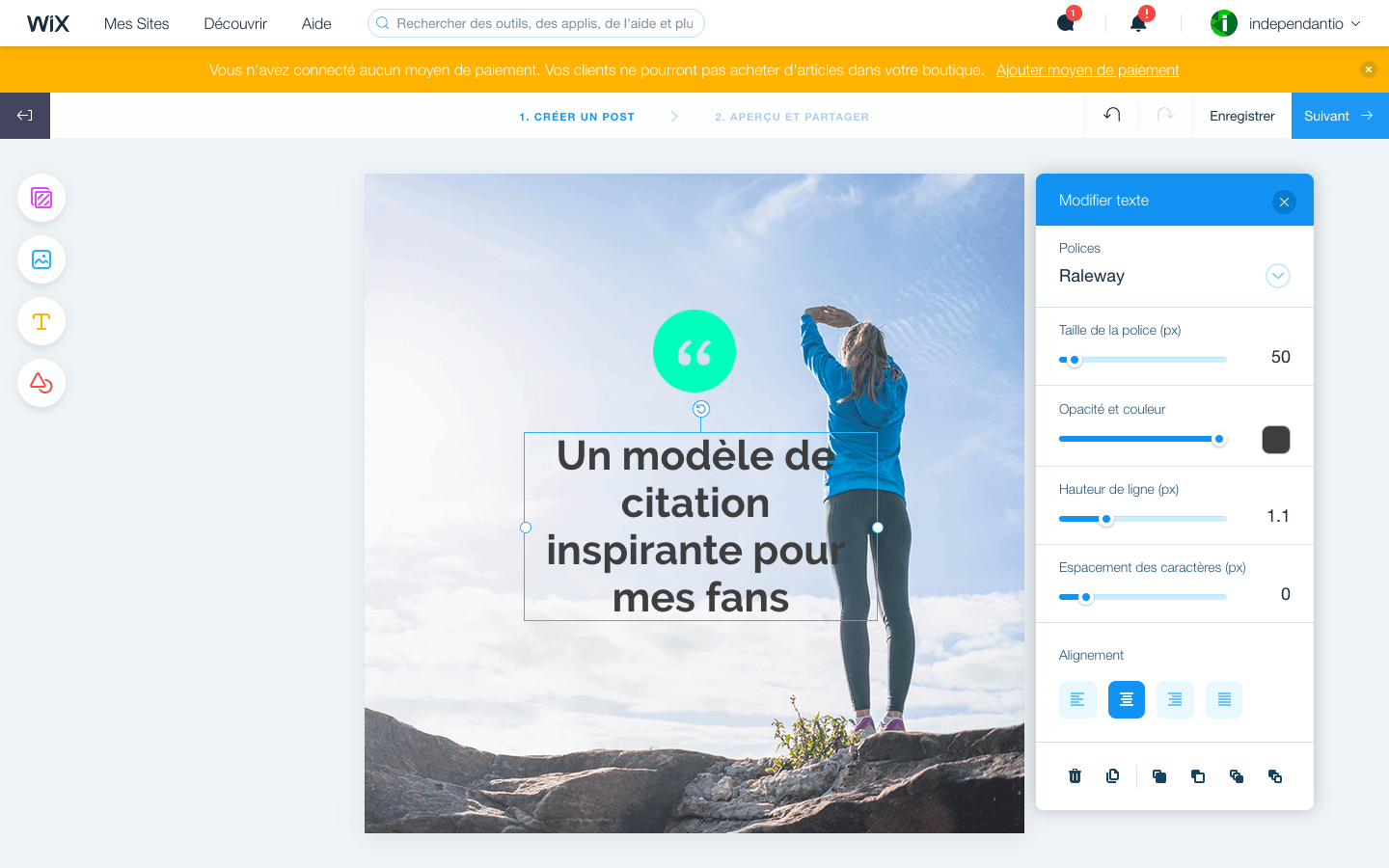 Vous pouvez connecter votre site à votre page Facebook ou Instagram, et publier des posts depuis votre administration Wix. Mais surtout, Wix embarque un éditeur d’images dédié aux réseaux sociaux : choisissez un modèle, modifier le texte ou l’image, et vous avez un visuel prêt en quelques minutes pour poster sur votre page.