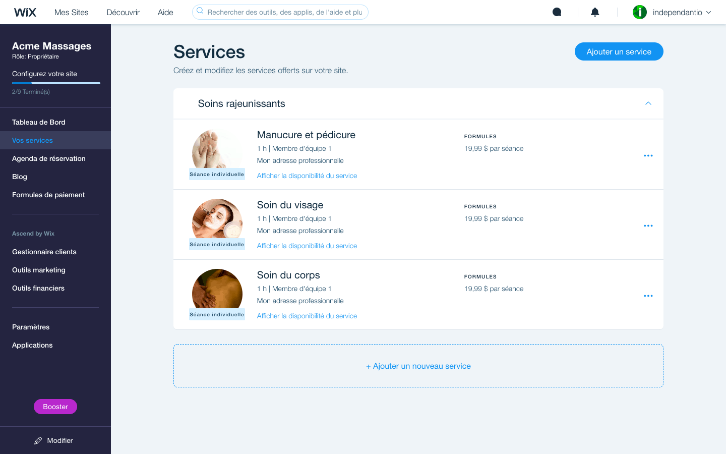 Mais Wix propose également le module Wix Booking, qui permet carrément de proposer sur votre site un catalogue de services que vos clients peuvent réserver sur un calendrier, moyennant un paiement en ligne.