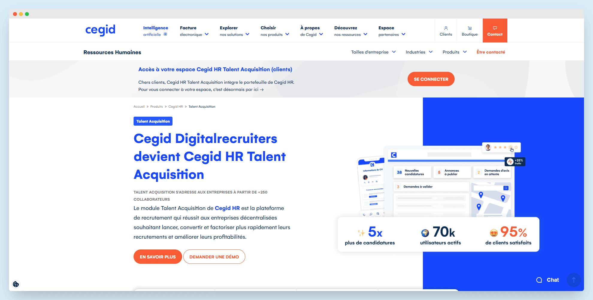 Cegid HR est le logiciel RH du célèbre éditeur français, spécialisé dans la gestion des talents, l’acquisition des compétences et l’analyse des données RH. Nous venons de présenter son module dédié au recrutement, mais sachez qu’il fait partie d’une solution de gestion des RH complète. L’avantage est de centraliser toute votre GRH sur un outil unique, performant et complet.