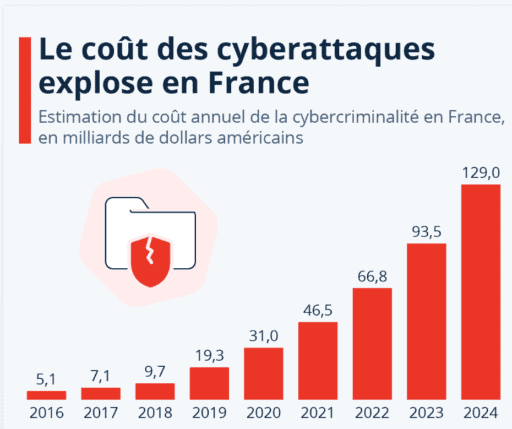 Le coût de la cybercriminalité explose en France. Selon Statista, le coût annuel de la cybercriminalité, en France en 2024, est estimé à un peu plus de 118 milliards d’euros (129 milliards de dollars américains). Ce montant est croissant depuis 2016. En effet, cette année-là, l’institut de sondage révèle que la cybercriminalité a coûté un peu plus de 5 milliards de dollars à la France. Depuis, ce chiffre explose : 19 milliards de dollars en 2019, puis 31 milliards en 2020 et finalement un peu plus de 93 milliards en 2023.
